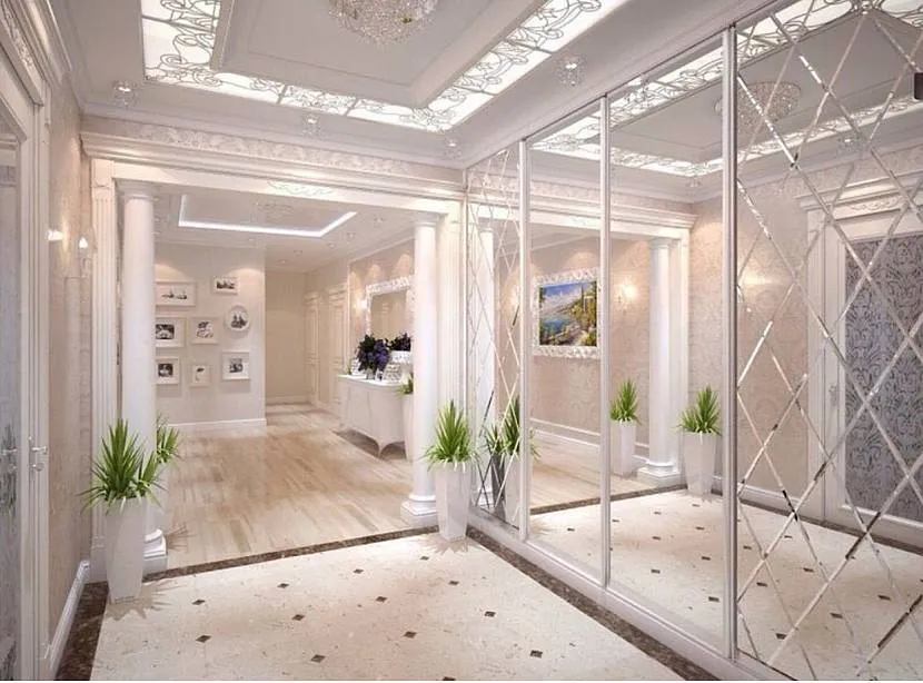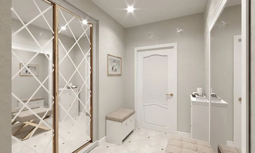 На фото зеркала, встроенные в шкаф в интерьере небольшого зала.
