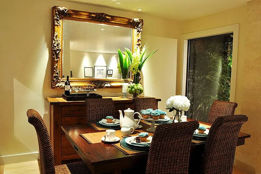 Отражающее стекло в рамке возле обеденного стола в гостинойИсточник rio-design.com.ua