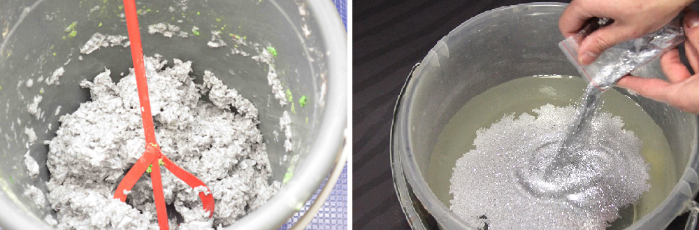 - Если в смеси присутствуют декоративные элементы, то для равномерного распределения сначала в воде размешивают их.