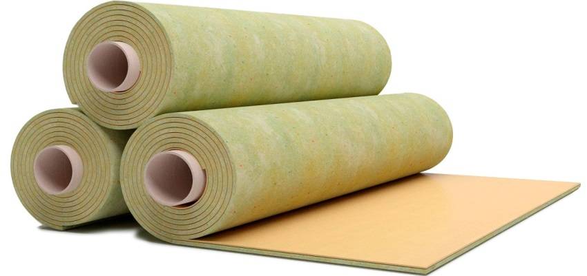 - Подложка (фольгированная, полистирольная, пробковая). Приглушает звуки в области напольных покрытий. Рулонные подложки используют для изоляции различных перегородок, балок, пола.